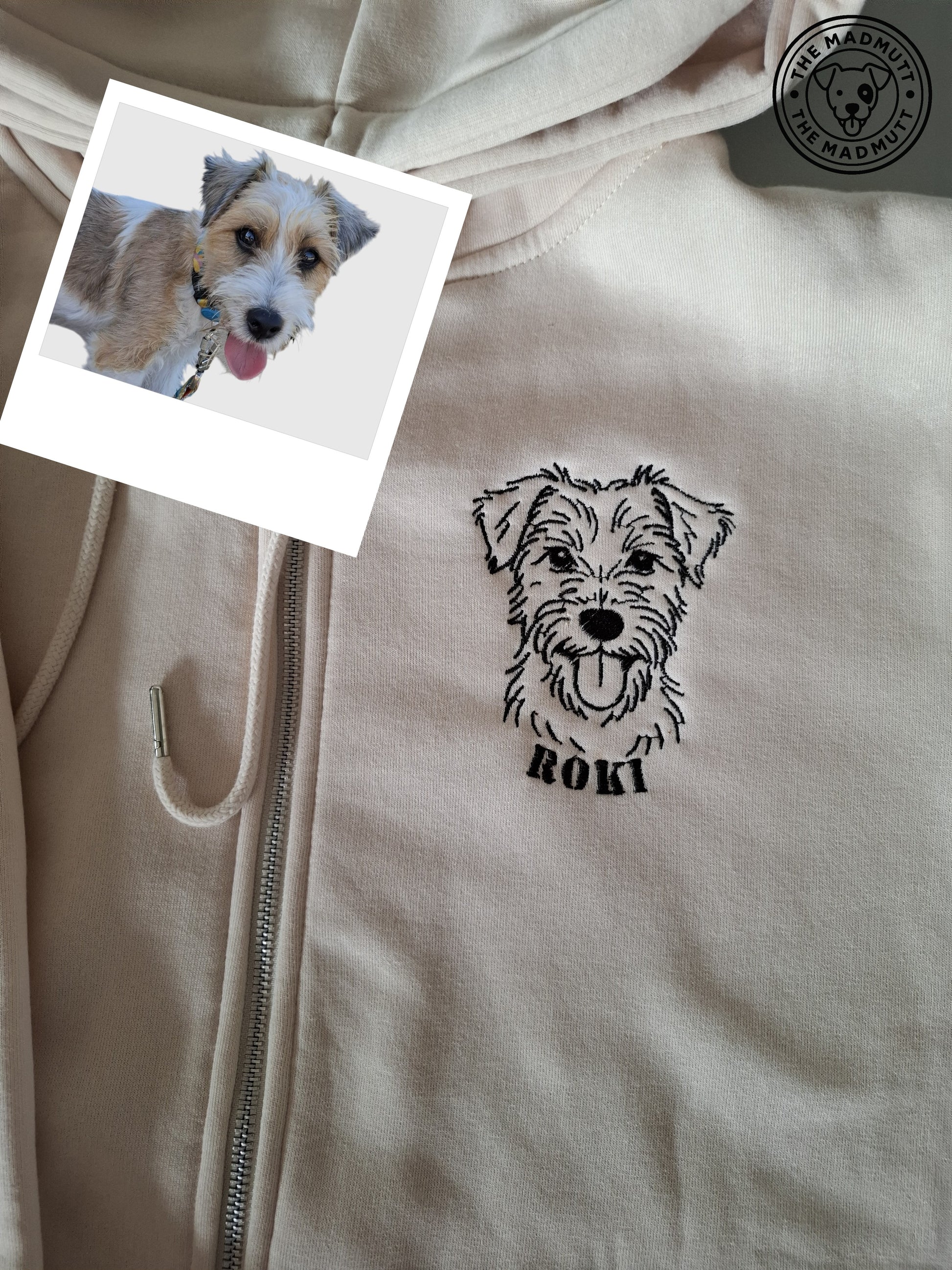 Nuestras sudaderas personalizadas Pet Friendly están hechas a mano y llevan el bordado de tu perro o gato en el pecho, y el sello de THE MADMUTT en la espalda.